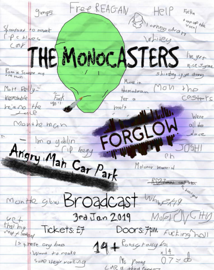 The Monocasters + Forglow/ Angry man Carpark January 3rd, 2019 Scruff Promotions Present: The Monocasters + Forglow + ANGRY MAN CAR PARK Tickets £7 in advance